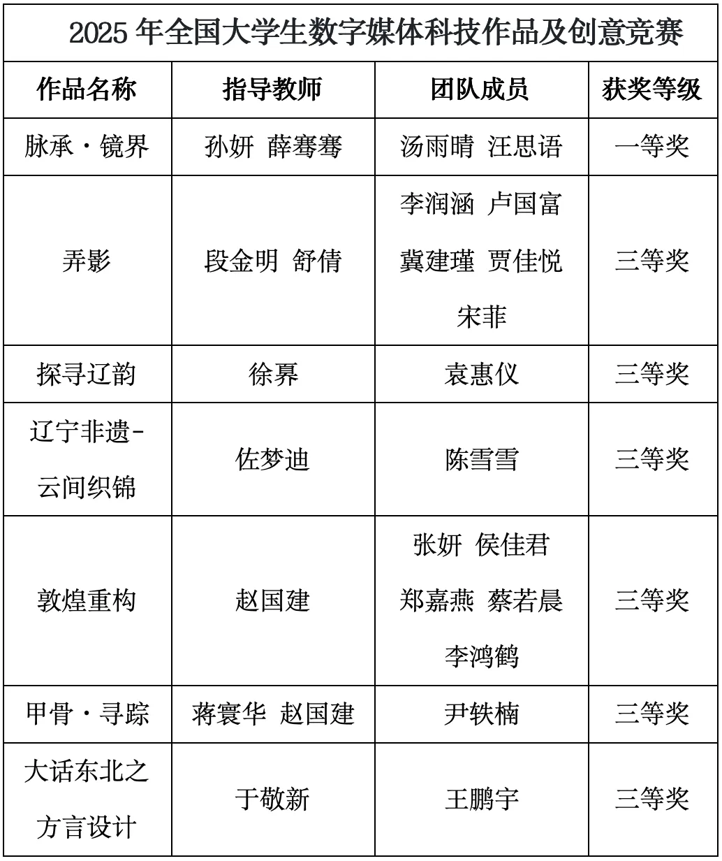 近日,2025年第十三届全国大学生数字媒体科技作品及创意竞赛全国现场总决赛圆满收官。我校学子凭借扎实的专业功底、创新的设计思维与出色的实践能力,在全国众多参赛队伍中脱颖而出,再创佳绩,斩获一等奖1项、三等奖6项。
