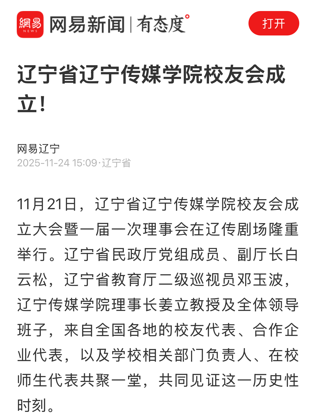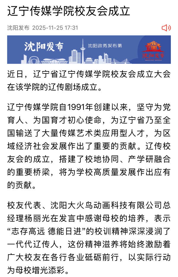 近日,沈阳日报、网易新闻等多家媒体报道我校校友会成立大会暨一届一次理事会隆重举行。报道指出,辽宁省辽宁传媒学院校友会的成立,将进一步筑牢校友与母校的情感根基,推动校友资源与辽传事业深度融合,助力辽宁传媒学院与区域发展同频共振。未来,辽传校友会将紧紧围绕学校发展战略,立足文化产业发展需求,凝聚辽传人的智慧力量,构建 “校友赋能、母校支撑、社会受益” 的良性生态,为我校建设高水平传媒类应用型大学注入强劲动能,为强国建设、辽宁全面振兴新突破贡献更大的“辽传力量”!