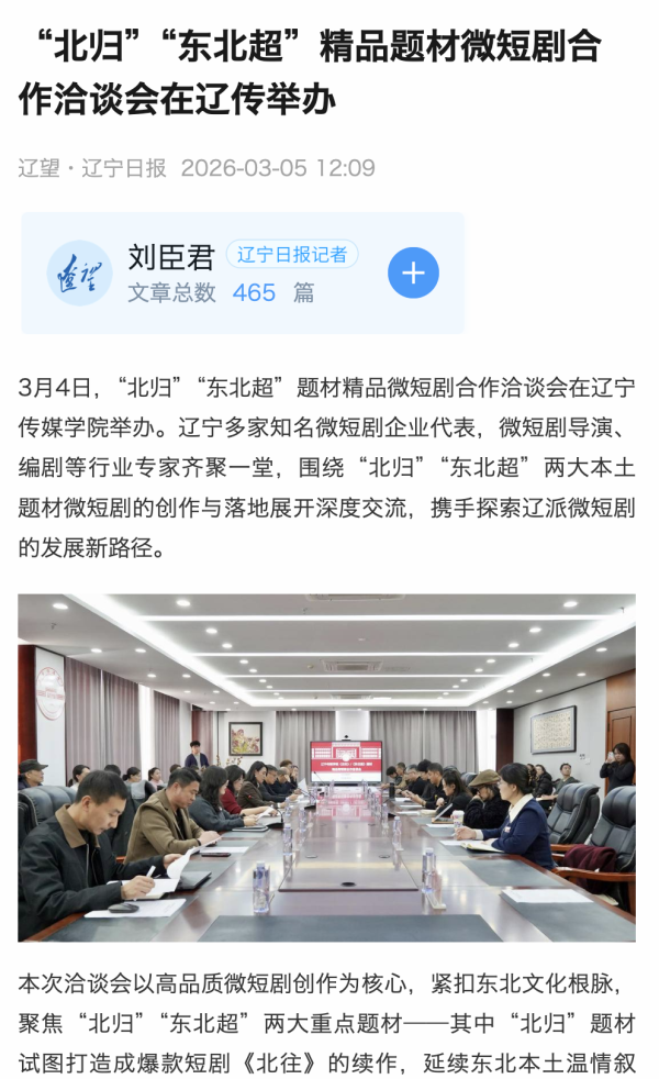 近日,辽宁省教育厅官网报道我校举办“北归”“东北超”题材精品微短剧合作洽谈会在。辽宁多家知名微短剧企业代表,微短剧导演、编剧等行业专家齐聚一堂,围绕“北归”“东北超”两大本土题材微短剧的创作与落地展开深度交流,携手探索辽派微短剧的发展新路径。