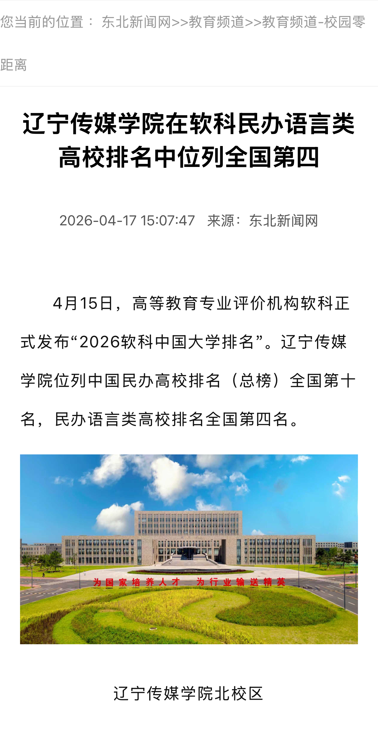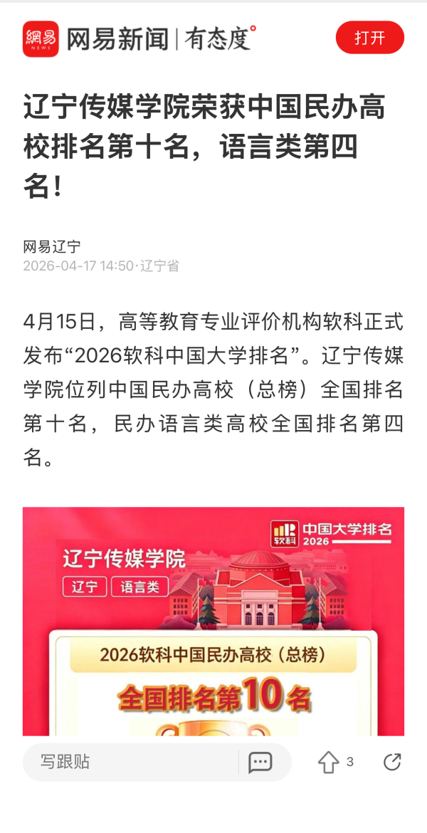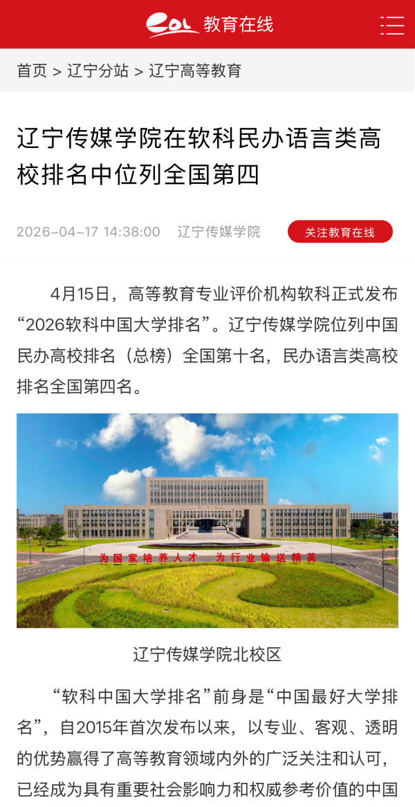 近日,中国教育在线、东北新闻网、网易新闻等多家媒体报道我校荣获中国民办高校排名第十名,语言类第四名。报道指出,高等教育专业评价机构软科正式发布“2026软科中国大学排名”。辽宁传媒学院位列中国民办高校排名(总榜)全国第十名,民办语言类高校排名全国第四名。
