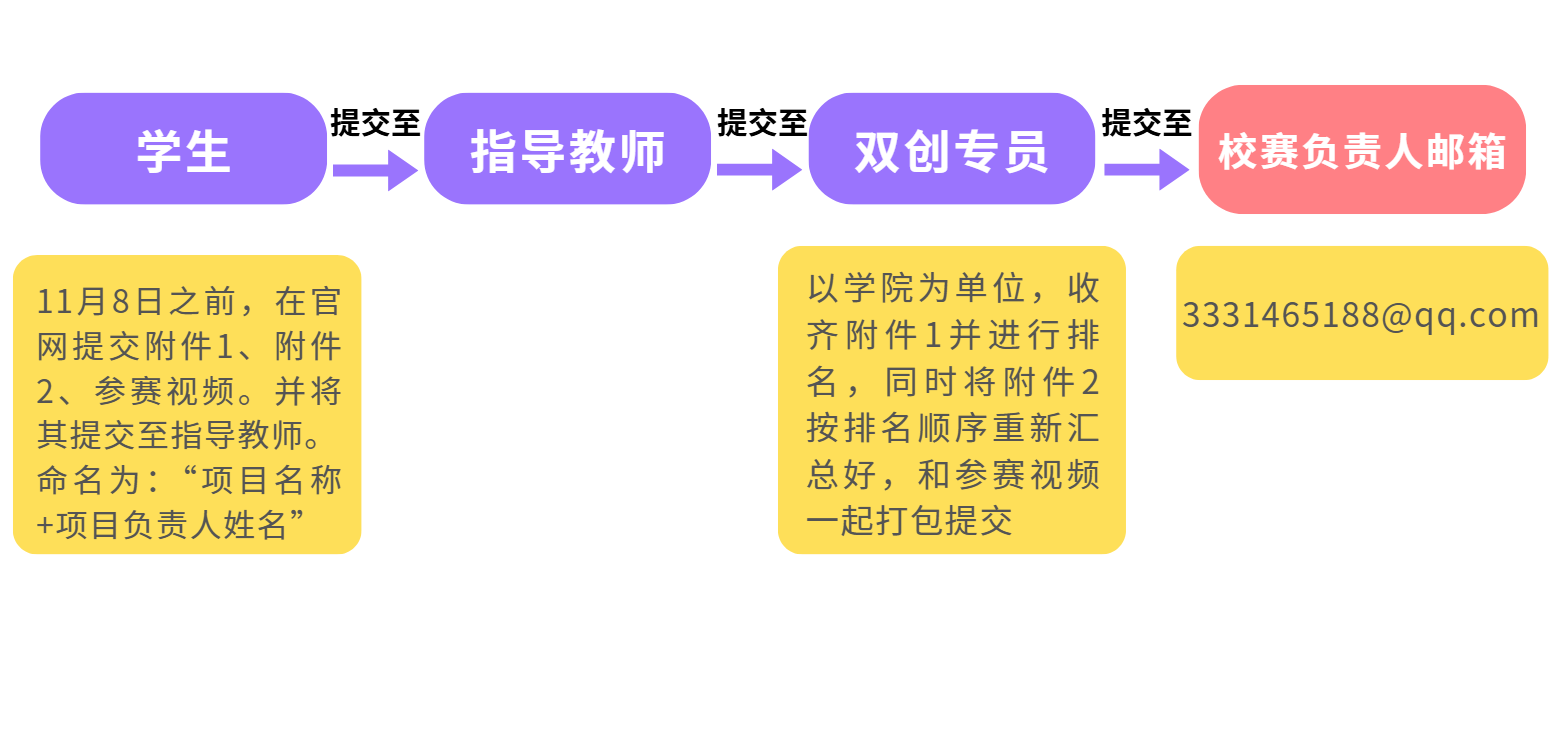 作品提交流程如图所示:【注:学生将附件1、附件2、参赛作品提交至指导教师的同时必须在双创平台上同步提交!】