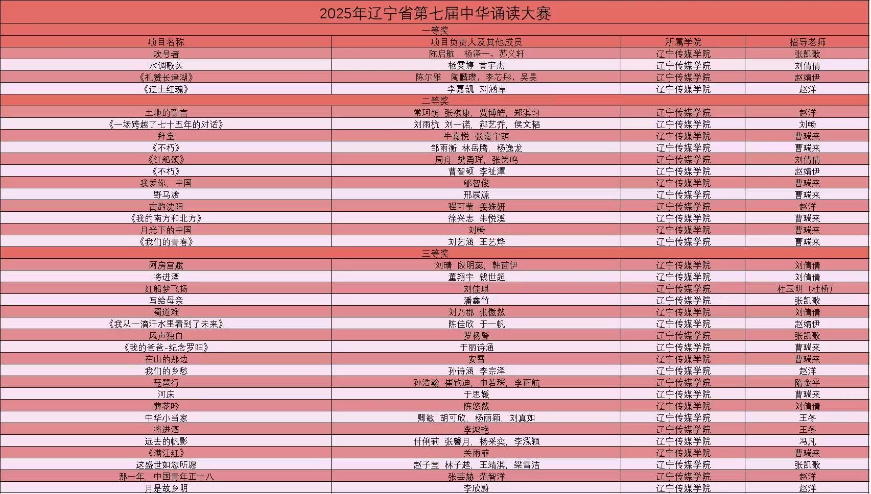 为深入传承中华优秀传统文化,大力推广国家通用语言文字,扎实推进全省语言文化事业建设,2025年辽宁省第七届中华诵读大赛历经初赛选拔、复赛评审、决赛展演等环节,各项赛事已全部圆满结束。本次大赛秉持公开、公平、公正的评审原则,经专家评审组严格评审、组委会复核,现已结束。在学校的精心培育与指导教师的匠心雕琢下,本届大赛涌现出一大批优秀选手与佳作。各参赛选手在比赛中展现出扎实的语言功底、良好的艺术素养和饱满的精神风貌,这不仅是选手个人努力的结果,更是学校诵读教育成果的集中体现,充分彰显了我校在推进中华经典传承、提升学生综合素养方面的显著成效。从而本次我校成功斩获一等奖4项,二等奖12项,三等奖20项。现将大赛获奖结果予以公示:       围绕“诵读中国”经典诵读核心赛项展开角逐。大赛不仅为全省诵读爱好者搭建了交流展示的平台,更以经典为纽带,推动中华优秀传统文化在青少年群体中落地生根。参赛选手以真挚情感传递经典力量,用标准规范的语言展现辽宁语言文化建设成果,让大家沉浸式感受诵读之美、文化之韵。大赛以经典铸魂、以声传情,参赛作品紧扣时代主题、根植传统文化,充分展现了辽宁省学生的文化素养与精神风貌。
