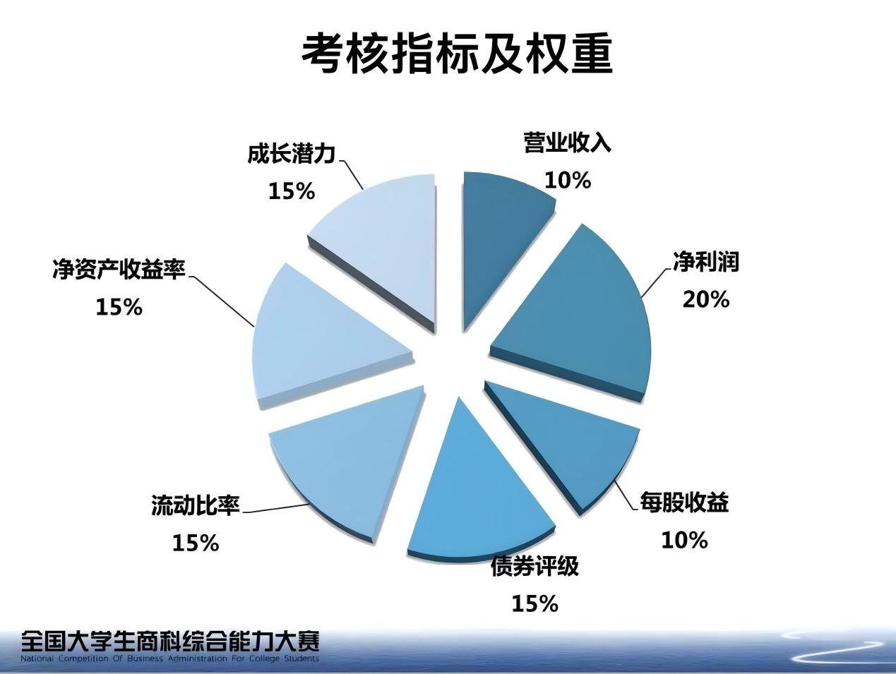 此次竞赛采用策鸿国际企业经营模拟软件作为竞赛专用平台,参赛学生由三人组成一个团队 模拟经营一家企业,参赛队员利用所学的知识共同制定企业战略以及生产部、市场部、物流部、财务部等各部门决策。系统根据销售收入、净利润、每股收益、债券评级、流动比率净资产收益率、成长潜力七个指标自动计算各参赛团队成绩。