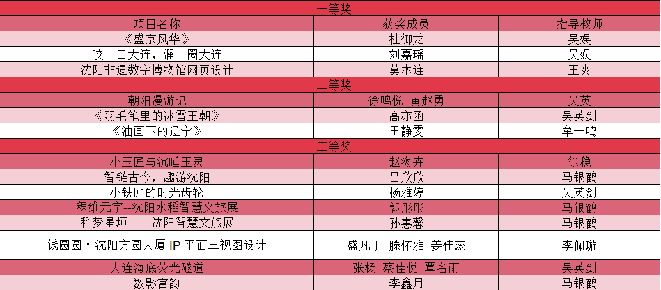 近日,辽宁省大学生城市文化创意设计大赛获奖名单正式公布,本次大赛以深耕辽宁地域文化、对接城市发展需求、接轨数字创意趋势为宗旨,助力辽宁城市文化传播、推动文化创意产业发展、展现大学生责任担当。挖掘辽宁城市风光、历史文化、科技生活、人文风光、民俗特色。以数字技术、文创、规划技术、网红打卡点、传统景观为中心。我校师生凭借坚实的课堂知识和丰富的实践经验取得了卓越的成绩。此次获奖,是对实践能力与创新水平的充分肯定。我校共获得一等奖三项、二等奖两项、三等奖八项