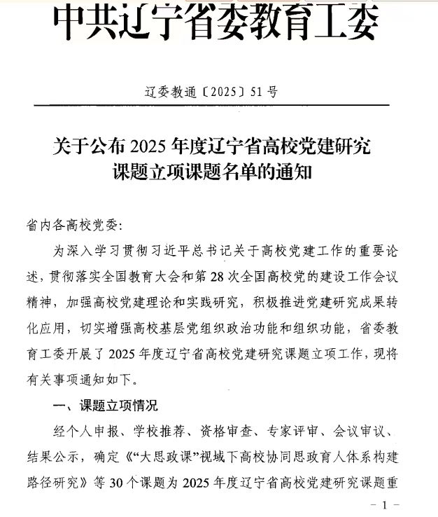 近日,中共辽宁省委教育工委印发《关于公布2025年度辽宁省高校党建研究课题立项课题名单的通知》(辽委教通〔2025〕51号),辽宁传媒学院在本次课题申报中喜获佳绩,2项课题成功立项,涵盖重点课题与一般课题类别,充分彰显了学校在党建理论研究与实践探索方面的实力。