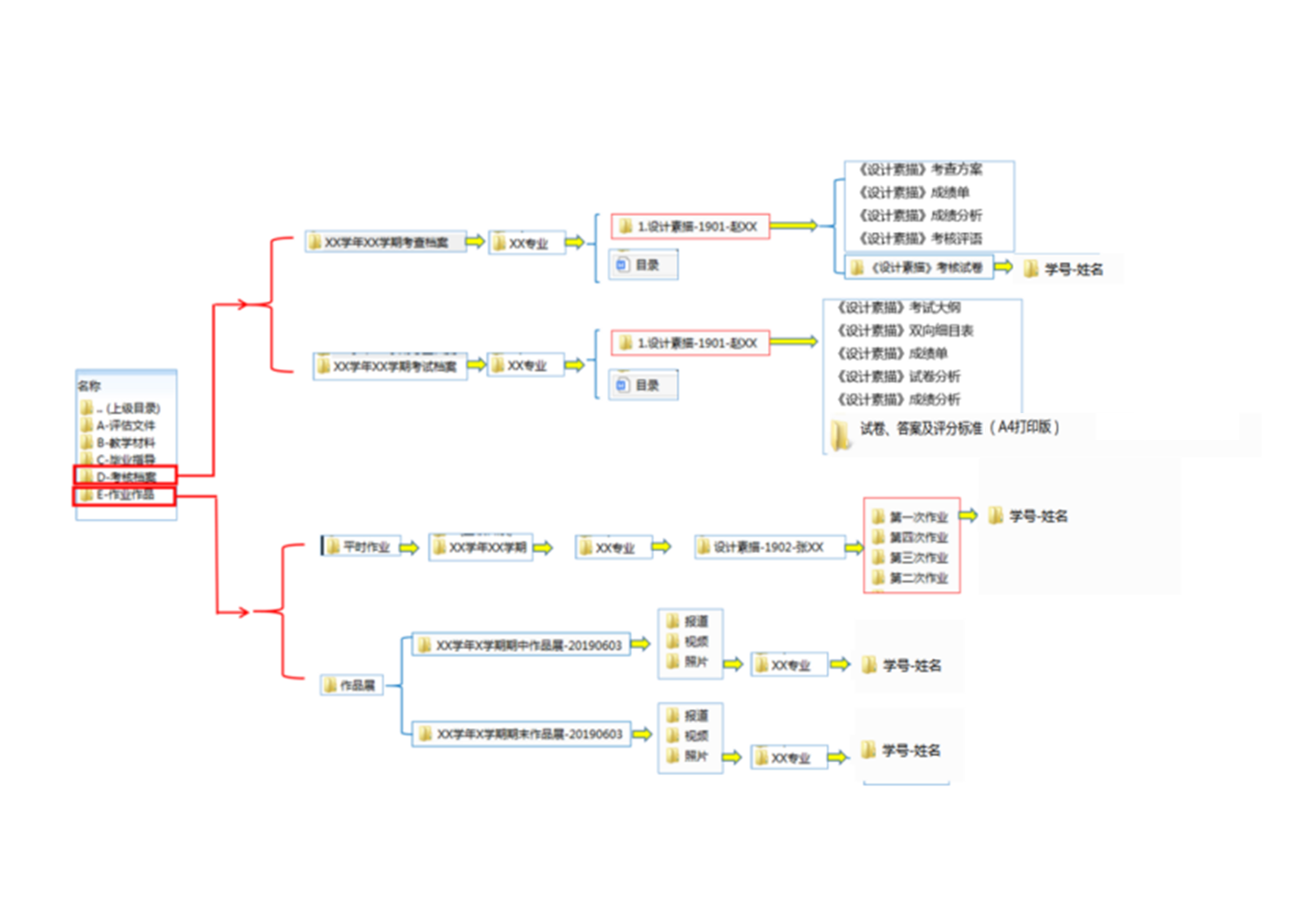 电子文档除包含纸质类对应电子文档外,还包括平时、期中、期末考核(作业)、作品展等内容。电子类文档请按照下图建立相应文件夹,并按照要求命名、存放。
