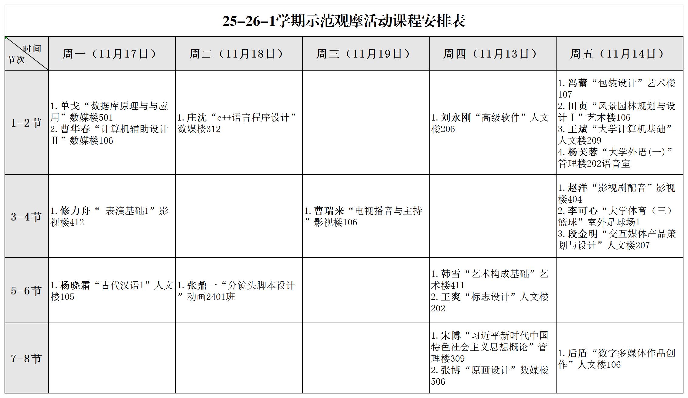 观摩活动时间:11月13日——11月19日。观摩活动课程安排详见下表。