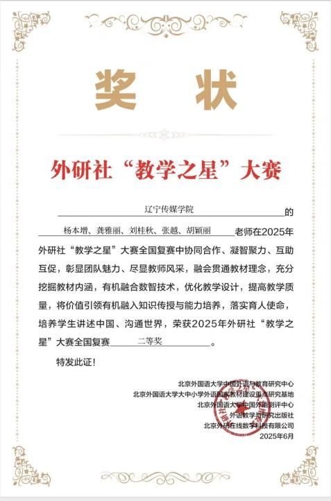 近日,捷报传扬辽传校园!备受教育界瞩目的2025年外研社”教学之星”大赛全国复赛圆满落幕,我校教师凭借扎实深厚的专业积淀、别出心裁的教学设计与收放自如的课堂驾驭功力,在全国众多优秀教育者中脱颖而出、绽放光彩,成功斩获全国复赛银奖殊荣。2025年外研社“教学之星”大赛汇聚了全国985高校及众多一流大学的优秀教师同台竞技,是对教师教学设计能力与综合职业素养的一次高水平检验。