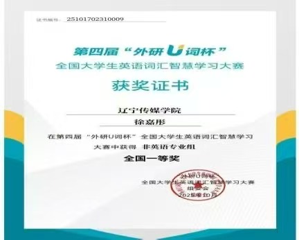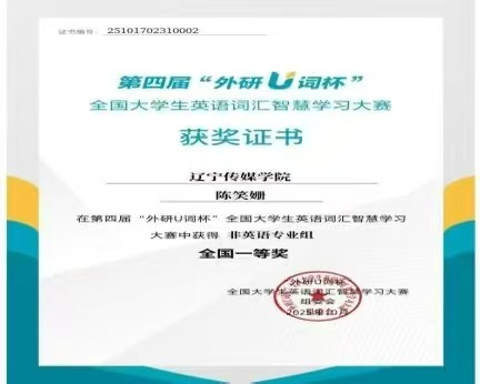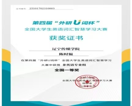 近日,我校学子凭借扎实的英语词汇功底与不懈的拼搏精神,在第四届“外研U词杯”全国大学生英语词汇智慧学习大赛上,斩获佳绩、载誉而归!本次大赛,共有来自全国31个省市自治区1400多所高校的十余万名学子通过“外研U词”微信小程序报名参赛。最终,辽传学子斩获全国一等奖9项、二等奖13项、三等奖23项。